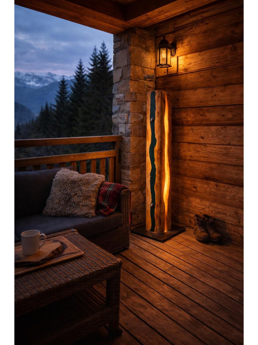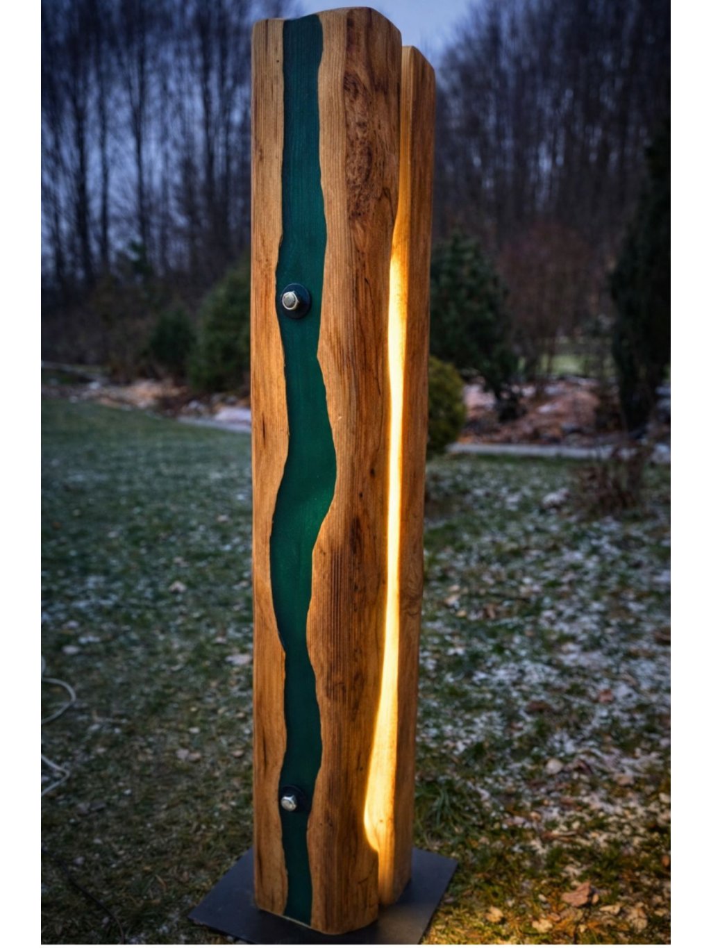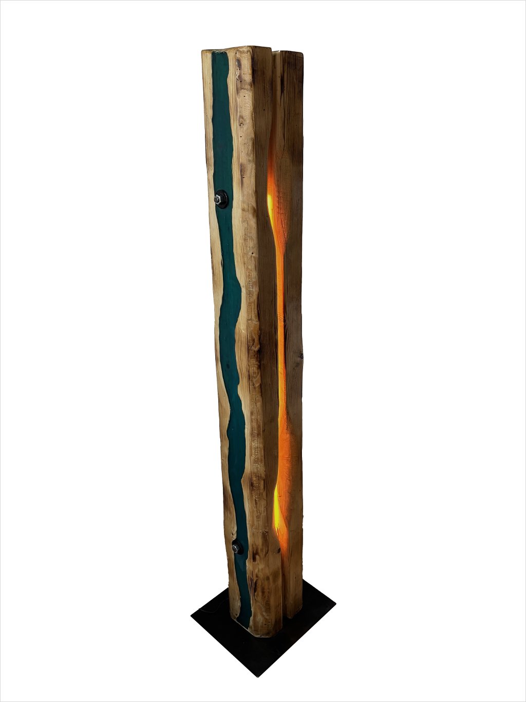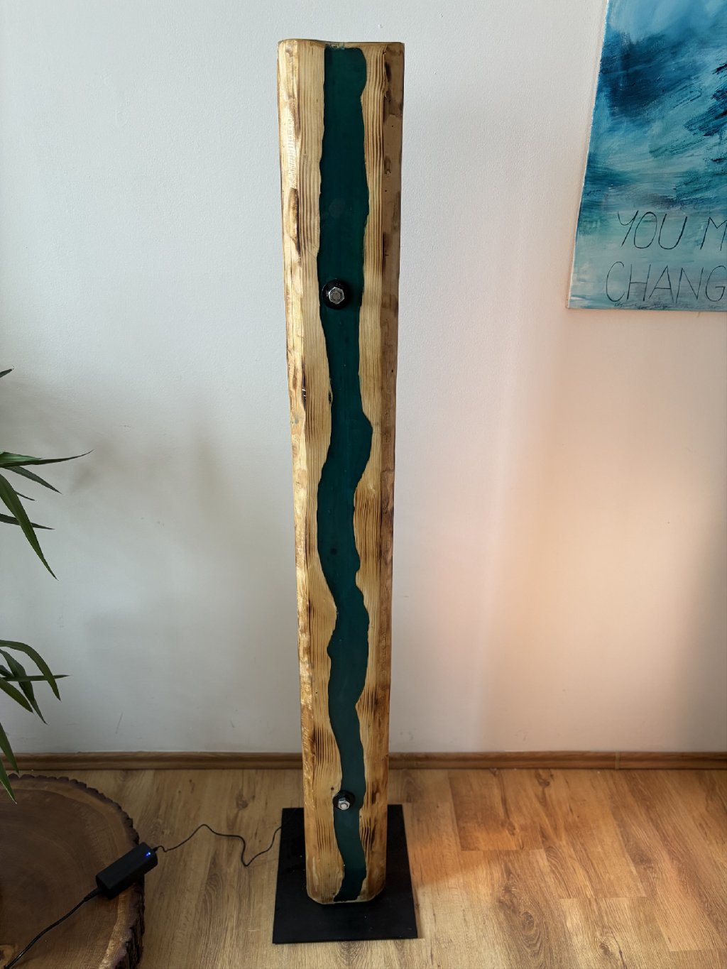 Je originální lampa vyrobená ze smrkového dřeva pocházejícího ze starých trámů, kombinovaná s ručně lité pryskyřicí v nádherné tyrkysové barvě. Každý kus je pečlivě tvořený ručně, přičemž lití pryskyřice je náročný proces, který vyžaduje přesné míchání, vrstvení a leštění, aby vznikl hladký, průhledný a esteticky dokonalý povrch. Výsledkem je jedinečný kus, kde se rustikální kouzlo dřeva spojuje s moderní, živou barvou pryskyřice.