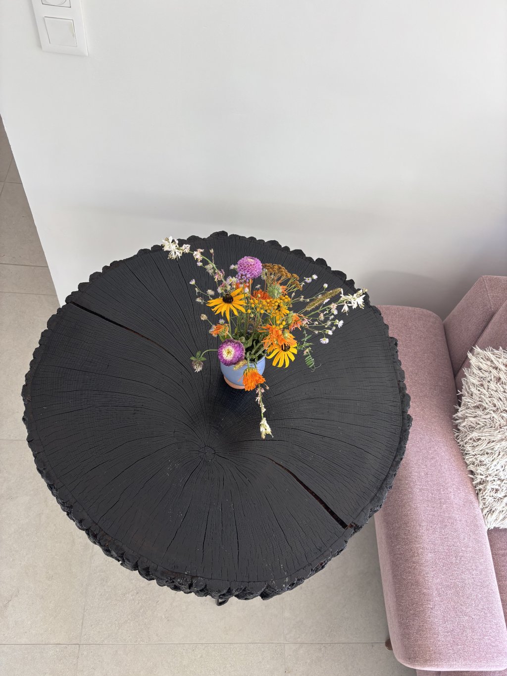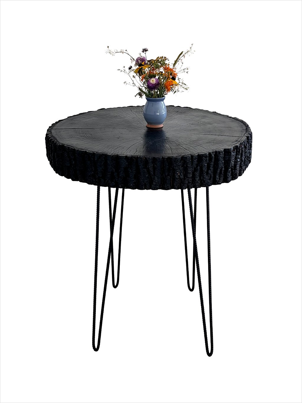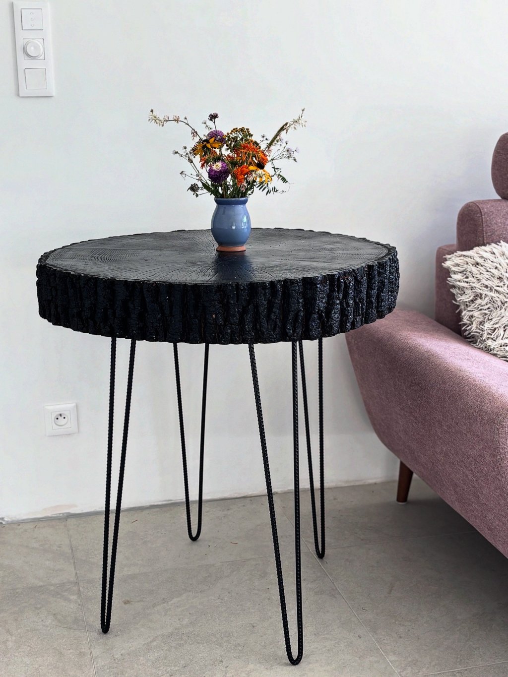 Konferenční stolek Ohnivý kruh spojuje dubový masiv s technikou shou sugi ban a ručně kovanými ocelovými prvky. Výsledkem je jedinečný designový solitér, který v sobě nese sílu přírody i stopu poctivého řemesla.